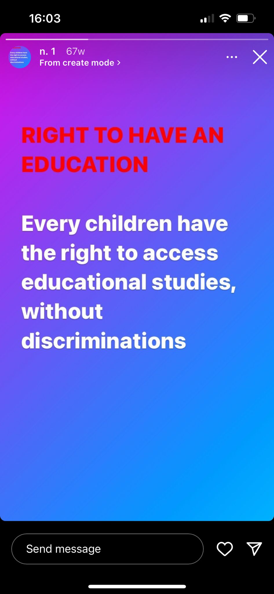 The last thing we posted are Instagram stories about children rights. This is what we believe are the six most important children rights. It is not ranking because we believe that these children rights are all equally important.